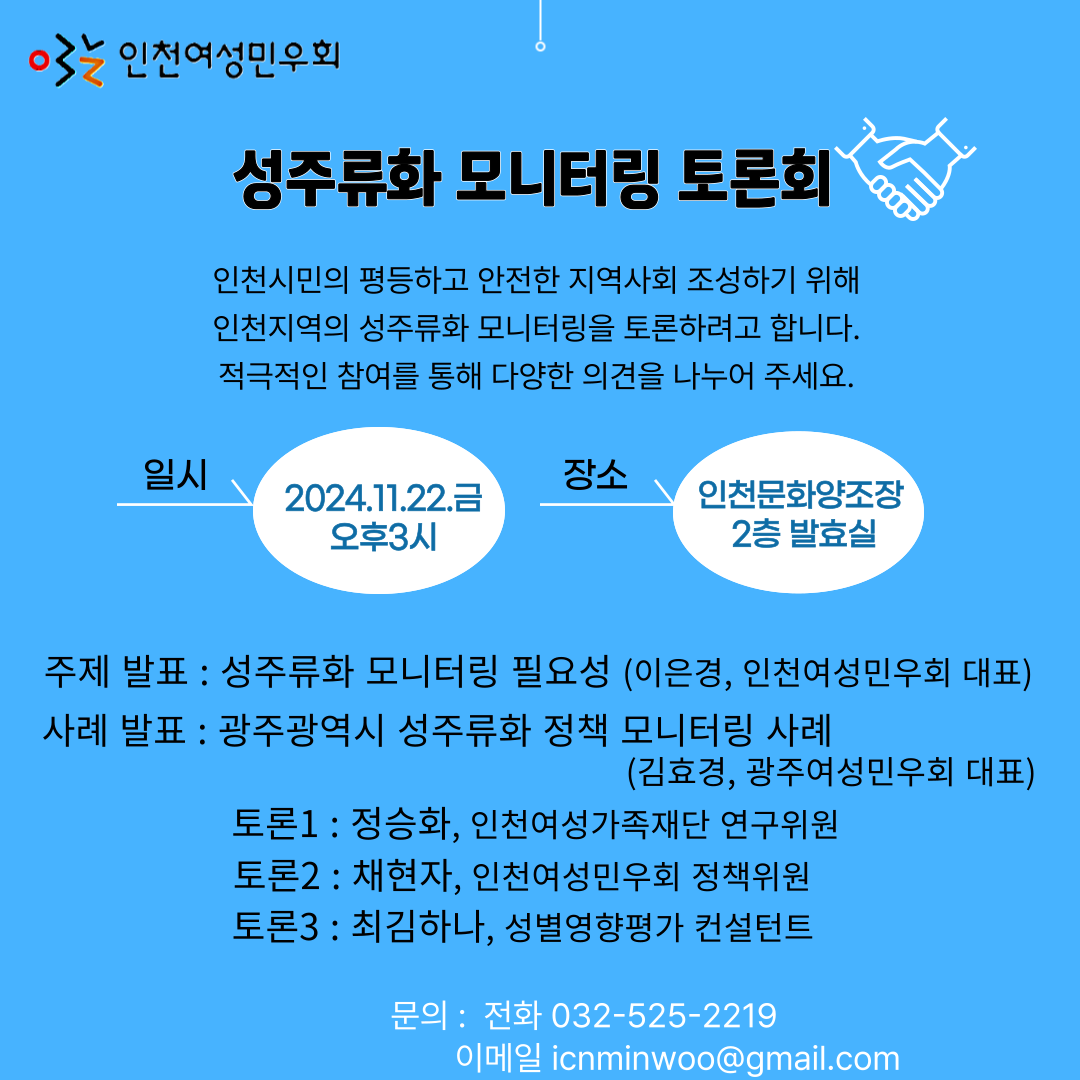 지방자치단체에서 추진하는 성주류화 사업과 인천지역 성(불)평등 이슈 관련 시민의 모니터링 필요성에 관해 토론을 합니다.